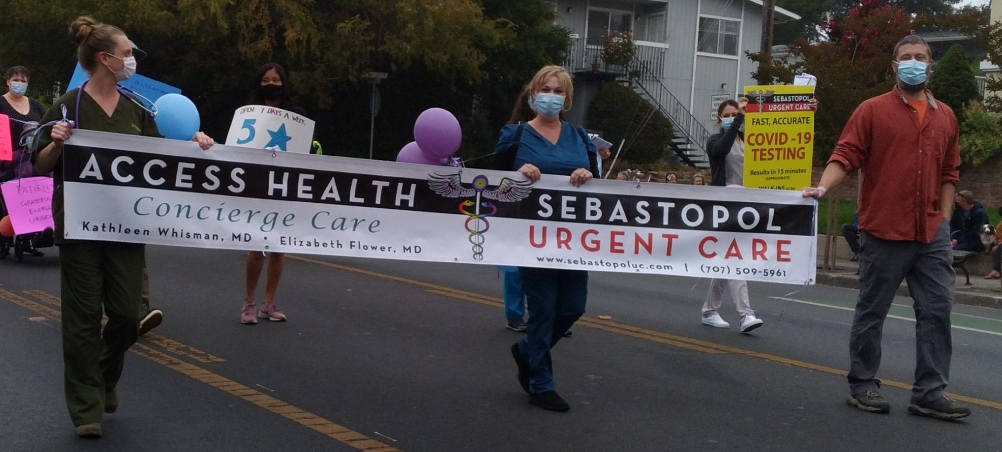 Two days later, after they checked my wound and changed my dressings, I asked if I could join them and ride in a wheelchair at our Saturday Apple Blossom Parade, to advertise that I was a very satisfied patient. I was eager to share my positive experience with our neighbors and to let people know we now have this “jewel” in our community staffed by two physicians who are compassionate and particularly sensitive to the needs of women, as they are the only female physicians in Sebastopol. I carried a sign to that effect in the parade and proudly sported my bandaged head, black eye, and happy smile amid staff from Sebastopol Urgent Care.