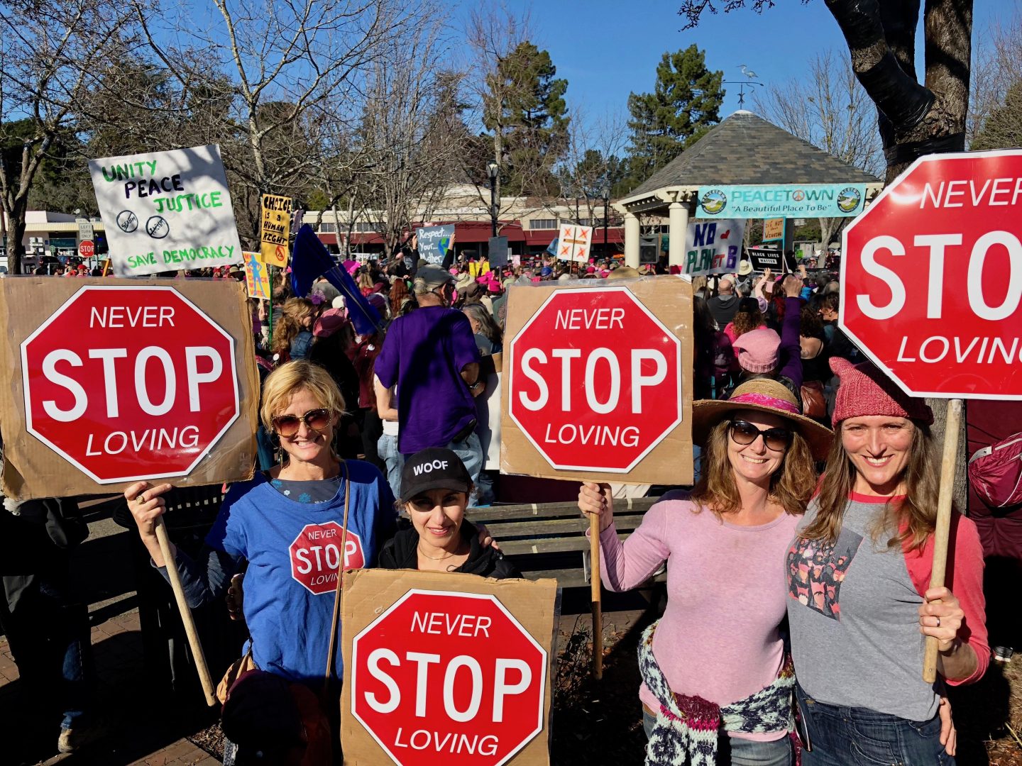 At noon on January 21, 2018, as hundreds of other women’s marches and rallies occurred across the United States to protest the one year inauguration of President Trump, a crowd estimated by the Sonoma Independent to number more than 1,000 women and men of all ages turned out in Sebastopol’s Town Square. The event, which drew the largest number of people ever to fill the public commons of “Peacetown, USA,” featured the legendary California singing duo known as MaMuse. Sebastopol City Council member and recent mayor Una Glass spoke of the common struggle for womens’ rights, justice and immigrant rights and 17-year old Mikaiya Gude later spoke on behalf of the many young activists in the crowd. Mikaiya’s short talk is reprinted in its entirety below. -Editor
