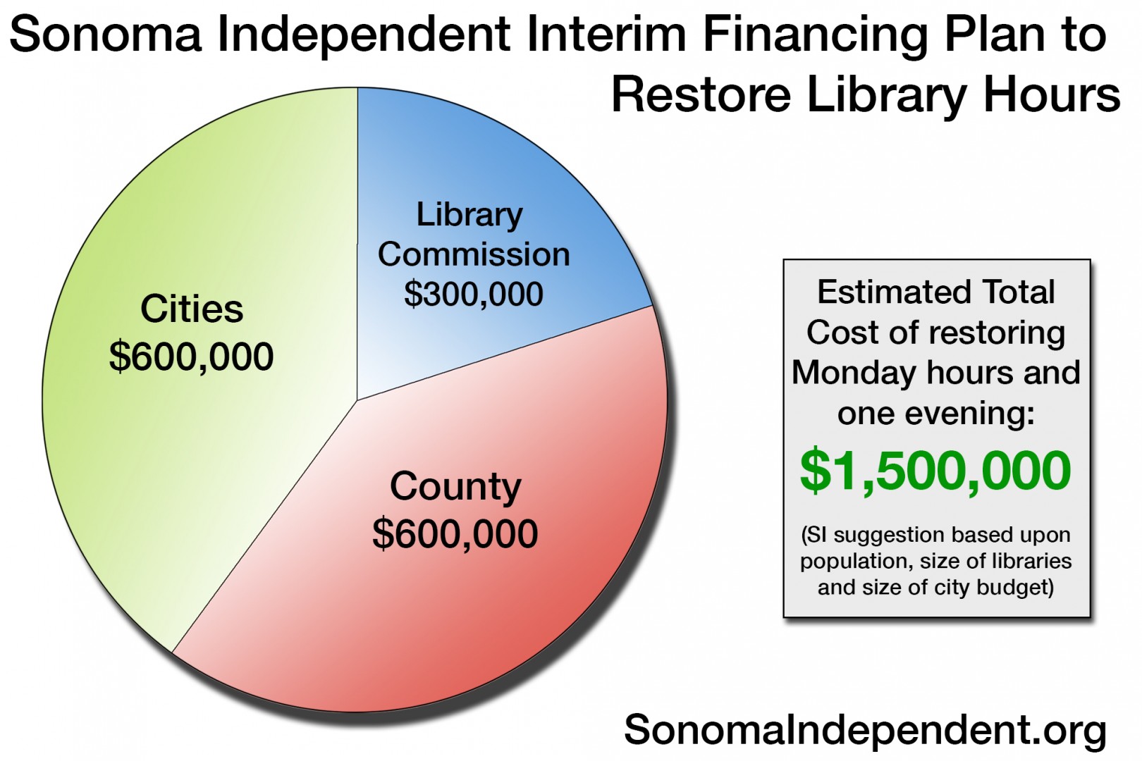 This Sonoma Independent proposal calls for the cost of restoring hours to be split between the County and seven cities, starting January 1, 2016. The County would contribute $600,000 annually, seven cities would share the other $600,000, and the Library budget would add $300,000 more. Because the funding would commence in the middle of the fiscal year (which ends June 30), the amounts to be paid for the first half a year of restored hours would be half the annual amounts described here.